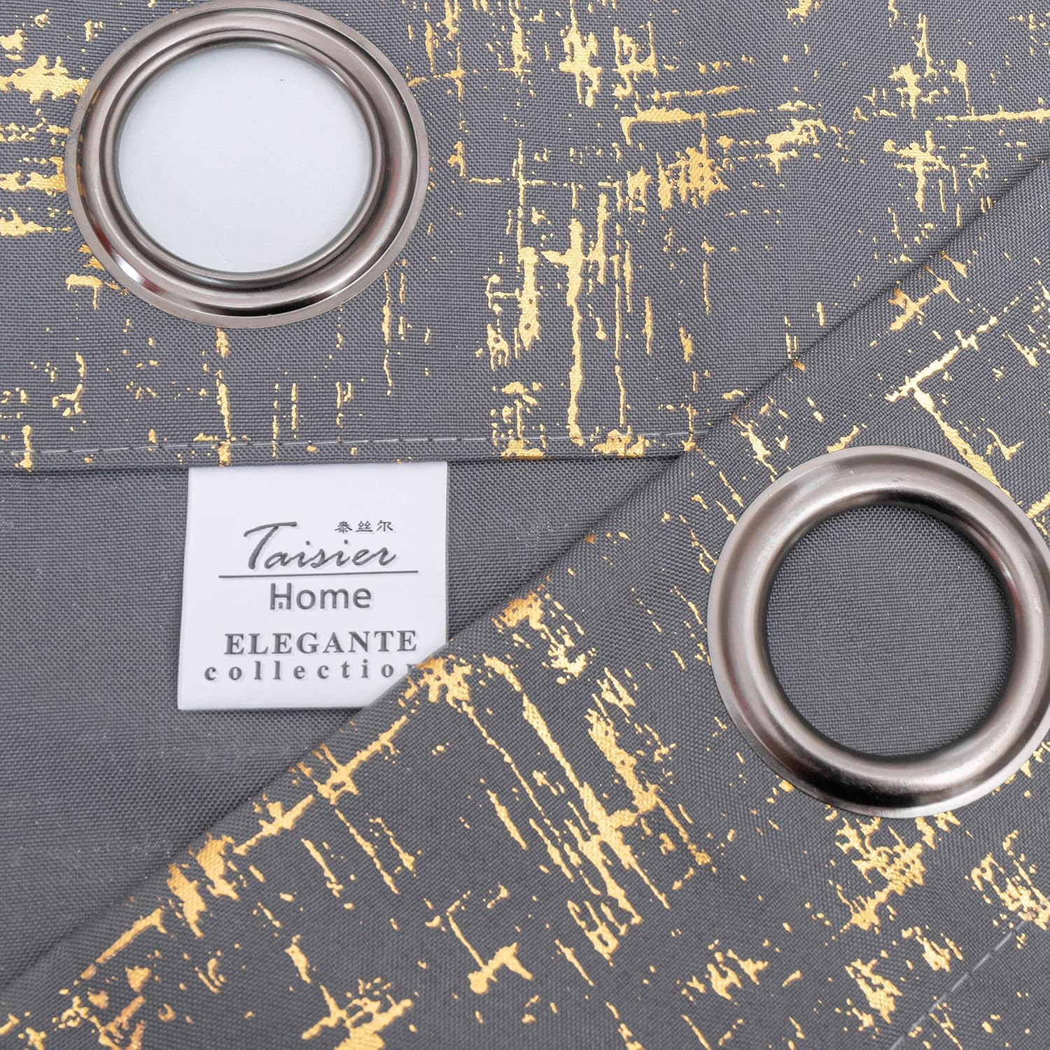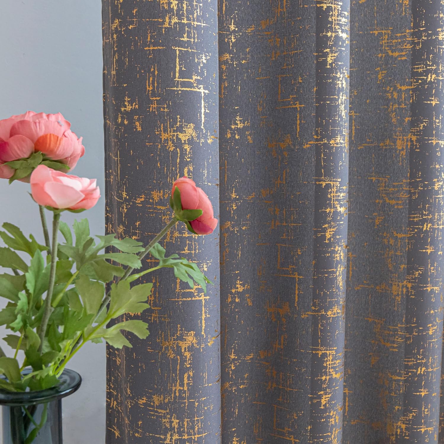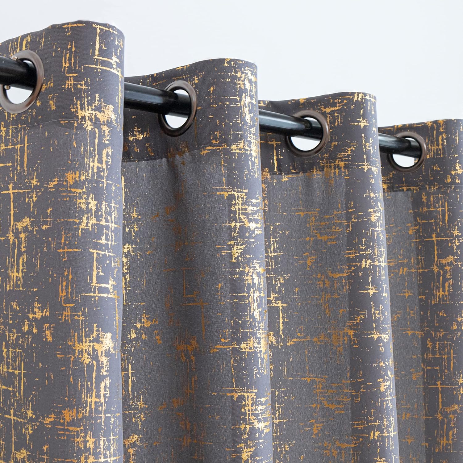 Grey & Gold Foil Print Textured Curtains 2 Panels